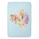 A bath mat with a cute watercolor painting of a mother lion holding her baby cub. A pretty purple floral bouquet below them, adds a gentle touch to this sweet and adorable image. Light blue background.