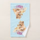 Towel set with a cute watercolor painting of a mother lion holding her baby cub. A pretty purple floral bouquet below them, adds a gentle touch to this sweet and adorable image. Light blue background.
