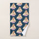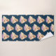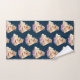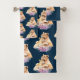 Towel set with a cute watercolor painting of a mother lion holding her baby cub. A pretty purple floral bouquet below them, adds a gentle touch to this sweet and adorable image. Dark blue background.