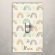 This adorable personalized light switch cover features a pattern of watercolor rainbows in soft pastel tones, including light pink, mint green, lavender and peach,