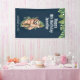 Birthday party banner with a cute watercolor design featuring a cute sloth hanging onto a tree branch surrounded by green tropical leaves.