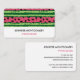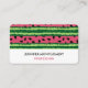 A business card with a cute watermelon pattern. Green rind in layers of stripes along with a layer of pink stripes with black seeds inside.