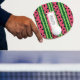 Ping pong paddle with a cute watermelon pattern. Green rind in layers of stripes along with a layer of pink stripes with black seeds inside.