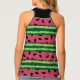 All over print tank top with a cute watermelon pattern. Green rind in layers of stripes along with a layer of pink stripes with black seeds inside.
