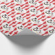 A cute penguin wedding wrapping paper featuring 2 penguins, the bride penguin is dressed in a white wedding dress with a heart tiara veil carrying a red rose bouquet and the groom penguin with a red bowtie and top hat with a red band surrounded by floating red hearts topped with a red sash and bow!