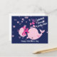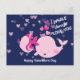 An adorable pink whale and a matching pink fish swim while spouting pink and purple hearts on this Valentine's Day postcard. The white text says "I Whale always love you" and "Happy Valentine's Day". The images and text are placed on a background of soft pink floating hearts. *Thanks to Pretty Graphik Design for the clip art used.