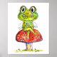 This is an original mixed media painting of a whimsical green frog sitting on a toadstool.