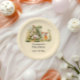 This baby shower paper plate is a charming blend of whimsy and warmth. At its center is a cozy cottage with a thatched roof, nestled among soft greenery and delicate florals. Beside the cottage stands a sweet anthropomorphic mouse in a yellow dress, adding a touch of storybook magic to the scene. The rounded square shape and gentle color palette give the plate a vintage, handcrafted feel—perfect for a celebration filled with love, imagination, and woodland charm. It’s a delightful detail that ties together the theme with both elegance and playfulness. Personalize with your own information.