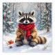 Super cute Christmas wall art that has an ai watercolor style illustration of a festive racoon sitting in a whimsical snowy forest during a winter day with a backdrop of holiday decorated pine trees.