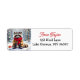 Super cute Christmas personalized return label stickers that has an ai watercolor style illustration of a festive racoon sitting in a whimsical snowy forest during a winter day with a backdrop of holiday decorated pine trees.