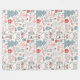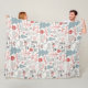 This cute Christmas fleece blanket features a fun whimsical pattern of Santa illustrations, trees, and presents in pink, red, and teal.