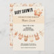 This invitation features a whimsical design with soft pastel beige, and orange / yellow hues. The front is easily customizable with all the important details of your event, while the back delights with a charming pattern of stars, pennants, balloons, rainbows, and storks, adding an extra touch of sweetness.