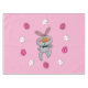 This table cloth is pink with a cute white bunny rabbit in the middle with orange nose rosy cheeks giving a thumbs up sign surrounded by a circle of pink and white dyed Easter eggs.