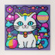 Adorable puzzle featuring a cute, whimsical, white cartoon kitty cat with big blue eyes, pink ears and wearing a bright colorful collar. She has a cute blue, pink and white striped tail and a blue stripe on her head. The background is mostly purple with planets, clouds, stars and flowers in a mix of bold, bright, vibrant colors. Ideal for anyone who loves cats and space.