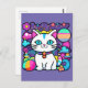 Adorable postcard featuring a cute, whimsical, white cartoon kitty cat with big blue eyes, pink ears and wearing a bright colorful collar. She has a cute blue, pink and white striped tail and a blue stripe on her head. The background is mostly purple with planets, clouds, stars and flowers in a mix of bold, bright, vibrant colors. Ideal for anyone who loves cats and space.