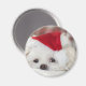 A magnet with an adorable photo of a cute white doggy wearing a red christmas hat.