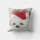 A pillow with an adorable photo of a cute white doggy wearing a red christmas hat.