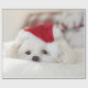 Wrapping paper with an adorable photo of a cute white doggy wearing a red christmas hat.