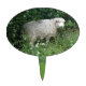 This awesome cake decoration features a photograph of a cute fluffy sheep. The sheep is surrounded by wild flowers and long grass and is eating some leaves. It has a thick white coat of wool and a cute black nose.