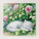 Sweet white kitten sleeping under a rose bush full of pink roses. Ai art done in a watercolor style.