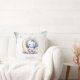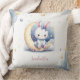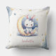 Super cute baby and kids throw pillow featuring cute white little bunny wearing a beautiful blue bow sitting on a lovely moon with some gold falling stars and some dusty blue clouds.