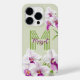 Cute and delicate white and magenta Orchids Flowers Monogram iPhone 14 Pro Case. Soft pastel green background.