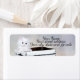 Adorable white Persian kitten in a grungy white crate on a pastel background cat lovers return address label
