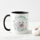 "LOVE MY POODLE" declares this mug for the miniature Poodle Dog owner. Each side of the mug has a beautiful watercolor portrait of an adorable white poodle in a blue green leaf wreath. Between the two images is the text, which may be easily customized, or even removed, by you.