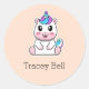 Cute white unicorn with blue and purple horn on pink background. Just add a name on this is a cute design.