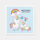 Paper napkins with a white mama unicorn with fancy colorful mane and tail. A baby unicorn laying down beside her, with a green pacifier in its mouth. A colorful rainbow with fluffy clouds, and some stars and heart decorate this sweet and adorable design. A bold pink outline surrounding the image gives it a child-like doodle vibe.