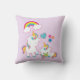 A pillow with a white mama unicorn with fancy colorful mane and tail. A baby unicorn laying down beside her, with a green pacifier in its mouth. A colorful rainbow with fluffy clouds, and some stars and heart decorate this sweet and adorable design. A bold pink outline surrounding the image gives it a child-like doodle vibe. Light purple-pink pastel colored background. Would look adorable in a childs bedroom.