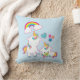 A pillow with a white mama unicorn with fancy colorful mane and tail. A baby unicorn laying down beside her, with a green pacifier in its mouth. A colorful rainbow with fluffy clouds, and some stars and heart decorate this sweet and adorable design. A bold pink outline surrounding the image gives it a child-like doodle vibe.Light blue pastel background. Would look adorable in a childs bedroom.
