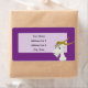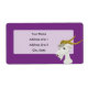 Personalized design with illustration of a head of cute white goat on purple background, design for kids, with customizable text template for your name or message