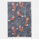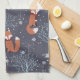 Adorable foxes dressed in red caps and scarves frolic in a snowy forest against a charcoal background.