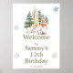 Rustic baby birthday poster with cute bunny rabbits, trees and snowflakes. Perfect for a winter birthday party. The words can be changed to suit your own details or requirements