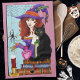 This whimsical fantasy illustration features a stylish witch with flowing red curls, her mysterious black cat companion, and a magical love potion resting atop ancient spell books. Surrounded by symbolic elements like candles, a spider web, potion bottles, and arcane charms, the scene captures the playful and enchanting spirit of modern witchcraft all in a backdrop of pink.