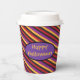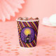 Some fun black , orange , red and purple striped paper cups with the design of a sweet child in a witch costume on the front and the words "Happy Halloween" on the back . They're perfect for a kids Halloween party . Find matching party supply in the collection below .