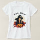 The illustration features a cute witch with a friendly smile, dressed in a classic pointy hat and a flowing robe.