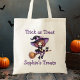 This cute little witch flying on her broomstick will delight your little trick-or-treater. The text fields are completely customizable.