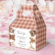 Cute and rustic baby shower favor box featuring watercolor illustration of a raccoon, fox, deer, owl, bear, and rabbit.