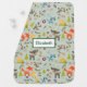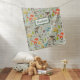 Blanket with a cute repeating pattern of illustrated forest creatures. Deer, foxes, rabbits, raccoons and owls. A light green color fills in the background. A rectangle nameplate with a forest green border is placed in the center with your recipients name inside. A whimsical fanciful design. I love patterns such as this with a playful sense of fun and whimsy. I hope you like it too.