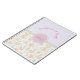 Spiral notebook with the bottom half decorated in a fun pattern illustrated with adorable foxes, cute little birds and whimsical green trees. The top half has a lavender purple background with a linen style texture. The center has a pastel green banner with a pink circle over top which holds the recipient's name.