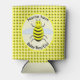 This awesome can cooler features a graphic image of a cute yellow baby bee with black legs and beady eyes. He has a yellow fuzzy body with black stripes and cute black antennae on his fuzzy head. His delicate little wings have a pale blue mottled pattern on them.