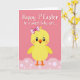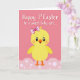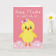 Designed with a sweet, simple look, this card features a round, fluffy yellow baby bird centered on a bubblegum-pink background, giving the scene a cozy, friendly mood 🌷. Its big dark eyes and tiny pink blush cheeks create a tender, inviting expression, like it’s sharing a shy little smile with someone special. A small orange beak curves gently upward, and a two-tone pink bow sits neatly on top of its head for a soft, affectionate touch. The bird stands on tiny orange feet above a light-pink, wavy foreground that feels like a cushion of petals, dotted with small white circles. Near the top, a short message appears in flowing white lettering with a faint shadow so it stands out clearly against the pink. The warm mix of yellow and pink keeps the focus on gentle closeness, like a friendly note passed between two people 🐰. The lower edge is filled with pale pink curves and scattered white dots that resemble little puffs floating across the bottom.