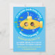 A happy yellow submarine adventure awaits! Drawn in cute cartoon illustration style on a blue background for a fun celebration!