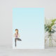 Destei's illustration of a pretty brunette woman doing yoga. The woman is doing the tree pose and her hands are in namaste. She is wearing a lilac shirt and dark grey pants. The background is a lovely blue gradient.