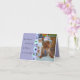 An adorable color photograph of a Yorkshire Terrier wearing a birthday cake hat adorns the front of this card. A lilac background with a retro design and text that reads: "Birthdays are nature's way of telling us to eat more cake." Inside customizable text reads: "No Birthday card Holds more love than this 'Cause it's mailed with a hug And it's sealed with a kiss! Happy Birthday".