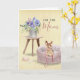 This cute Mother's Day card features an adorable watercolor illustration of a Yorkshire Terrier sitting in its puppy dog bed with a leash in its mouth. The scene on the front of the card includes a dog bowl, bone and wooden table with a flour tin can of beautiful flowers over a cream background. The inside of the card includes a cake and reads "Happy Mother's Day! (my food dish is empty)". Personalize it with your your own greeting, precious pet's name in the food dish (on the front and inside of the card) and inside signature above the paw print.