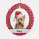 This charming design features a watercolor-style picture of Yorkshire "Yorkie" Terrier in a Santa Clause hat with your or your recipient's dog's name in a band of red underneath. The image is encircled in green, with a cute little white bow against a red background. Make sure to type the name or message you want in the Personalize section.