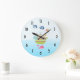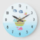 A clock with a cute nursery style illustration with an ark filled with wild animals and a butterfly flying overhead and a friendly whale spouting water below. Some blue clouds float on by. Set on a light blue ombre background.